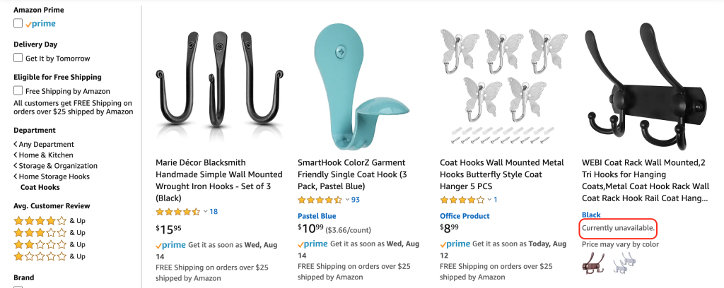 As previously mentioned, Amazon typically does not show out of stock items by default. This is because out of stock items can quickly lose their ranking and fall out of search results. To find these items, it is necessary to narrow down the search criteria by selecting a subcategory, filtering by brand, setting filter attributes such as color and shape etc. In our example, we'll select the "Coat Hooks" subdepartment: