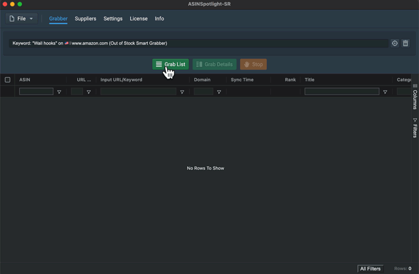 Click on the "Set Target to Scan" button next to the search field. Then, go to the "Keywords" tab, enter the desired keywords, check the box for "Out of Stock Smart Grabber" and click "Save". It is also possible to enter multiple keywords, one per line.